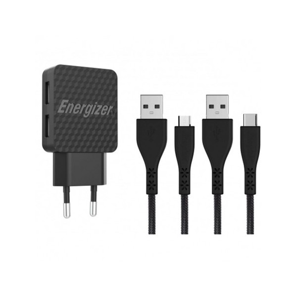 Chargeur secteur Energizer 2.4A 2 Port USB + Câble Type C + Cable Micro-Usb - Puissance: 12 W - Intensité: 2.4 A - Lifetime Warranty - Matériaux ultra-résistants - Design effet 3D - Charge et synchronisation rapide - Smart IC: Répartition intelligente de la charge entre deux ports USB - Couleur: Noir - Garantie 1 an