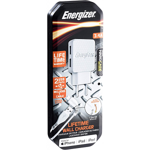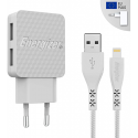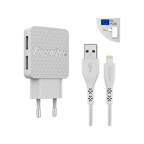 Chargeur secteur Energizer 3.4A 2 Port USB + Câble Lightning - Puissance: 17 W - Intensité: 3.4 A - Lifetime Warranty - Matériaux ultra-résistants - Design effet 3D - Charge et synchronisation rapide - Smart IC: Répartition intelligente de la charge entre deux ports USB - Couleur: Blanc - Garantie 1 an